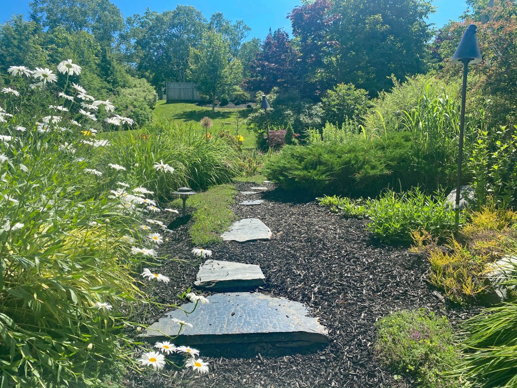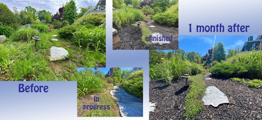 Realistically I could leave a full time employee on that property all summer long to deal with the weeds and most of them were in that one showpiece garden! I have my doubts that she could even keep up. Even if that is an option for you do you really want a gardener at your house literally all summer long? This garden was FULL of everything you could possible put in a garden, lots of shrubs, perennials, annuals a slate pathway, wired garden lights and of course a full carpet of weeds. One thing it didn’t have though was a stitch of mulch. The other gardeners that tackled this garden just didn’t have the infrastructure to bring enough in.