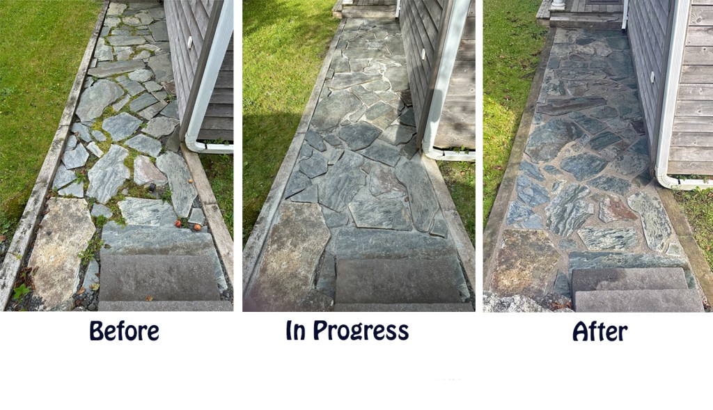 Flagstone walkways, patios and paths are some of the more popular choices in this area. Given the shortfalls of previous filling options there’s always one or two on the list that need to be re-done. This year I had three walkways and one patio that were looking pretty rough and needed attention. The photos in this post show the process of installing Easy Joint and making them look their best again. My polymeric sand supplier let me know that there was a new better option available for flagstone though most installers were still opting to use the familiar polymeric sand.
