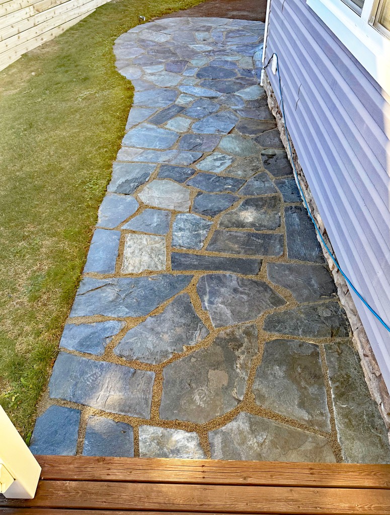 One property had a walkway filled with crusher dust that had gotten weedy and sunk and the other had two walkways and a patio with crumbling polymeric sand. Neither product had stood up to the test of time and honestly had aged pretty terribly. The supplier let me know that Easy Joint was newly available and was now the recommended product for natural flagstone installations. After some research, it seemed like the most appropriate choice. This product has been available for quite a bit longer in the United Kingdom and reviews suggested it would be longer-lasting than our traditional options.